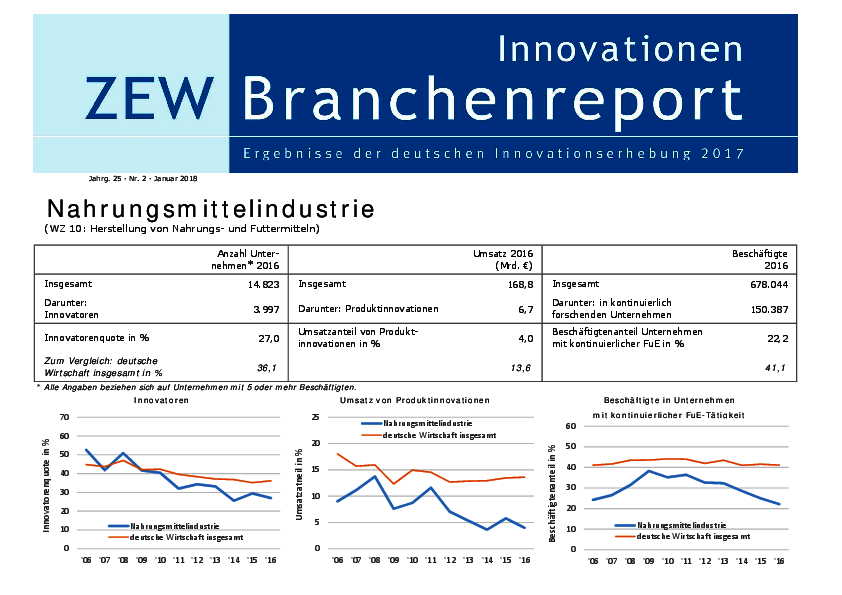 Der Branchenreport Innovation für die Branche Nahrungsmittelindustrie stellt die Innovationsleistung der Branche im Jahr 2016 dar. Der Anteil der Unternehmen mit Innovationen lag bei 27 %. Die Innovationsausgaben im Berichtsjahr beliefen sich auf 1,68 Mrd. €. Der Umsatzanteil mit Produktinnovationen betrug 4 %.