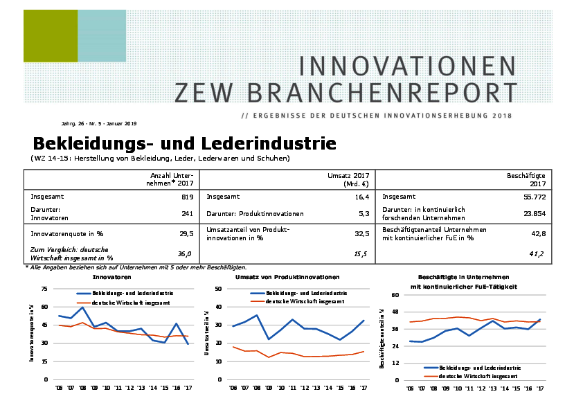 Der Branchenreport Innovation für die Branche Bekleidungs- und Lederindustrie stellt die Innovationsleistung der Branche im Jahr 2017 dar. Der Anteil der Unternehmen mit Innovationen lag bei 29,5 %. Die Innovationsausgaben stiegen gegenüber dem Vorjahr um 16 % auf 0,70 Mrd. €. 11 % der Unternehmen wiesen eine kontinuierliche FuE-Tätigkeit auf. Der Beschäftigungsanteil von Unternehmen mit kontinuierlicher FuE betrug 42,8 %.
