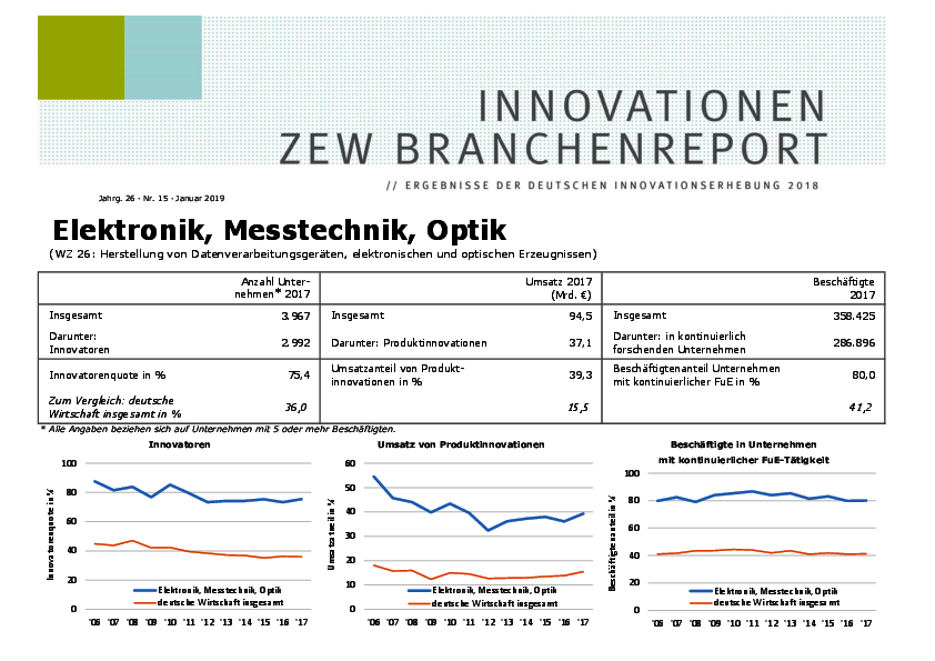 Der Branchenreport Innovation für die Branche Elektronik, Messtechnik und Optik stellt die Innovationsleistung der Branche im Jahr 2017 dar. Der Anteil der Unternehmen mit Innovationen lag bei 75,4 %. Die Innovationsausgaben stiegen gegenüber dem Vorjahr um 6 % auf 12,50 Mrd. €. Der Anteil der Unternehmen mit kontinuierlicher FuE lag bei 56 %. Der Beschäftigungsanteil von Unternehmen mit kontinuierlicher FuE betrug 80 %.
