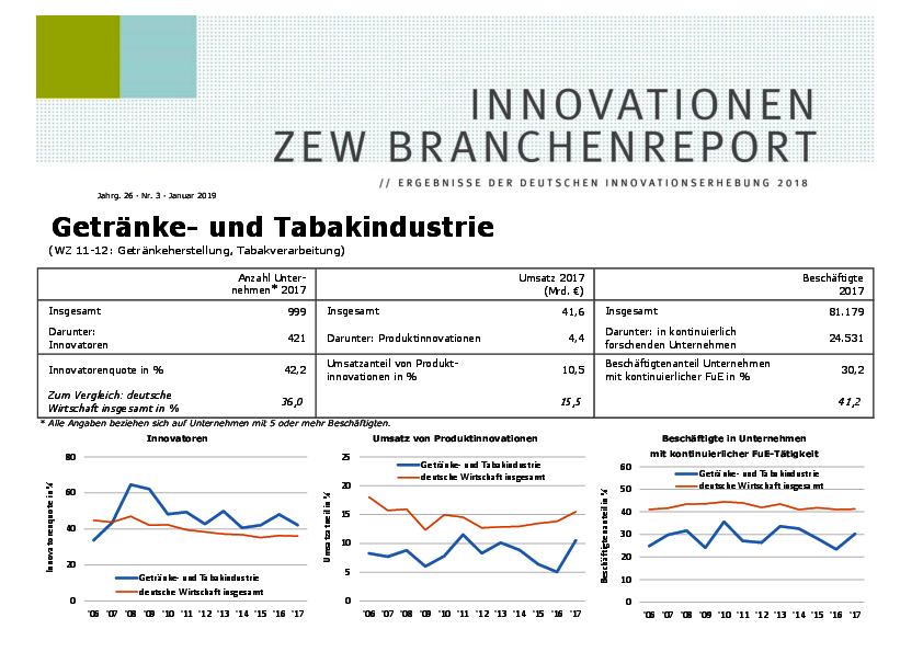 Der Branchenreport Innovation für die Branche Getränke- und Tabakindustrie stellt die Innovationsleistung der Branche im Jahr 2017 dar. Der Anteil der Unternehmen mit Innovationen lag bei 42,2 %. Der Anteil der Innovationsausgaben am Branchenumsatz (Innovationsintensität) belief sich im Berichtsjahr auf 1,4 %. Der Umsatzanteil mit Produktinnovationen betrug 10,5 %.