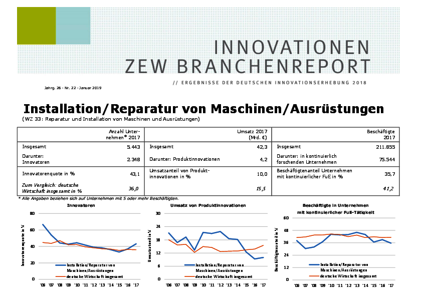 Der Branchenreport Innovation für die Branche Installation und Reparatur von Maschinen und Ausrüstungen stellt die Innovationsleistung der Branche im Jahr 2017 dar. Der Anteil der Unternehmen mit Innovationen lag bei 43,1 %. Die Innovationsausgaben sanken gegenüber dem Vorjahr um 3 % und beliefen sich auf 0,92 Mrd. €. Der Anteil der Unternehmen mit kontinuierlicher FuE lag bei 13 %. Der Beschäftigungsanteil von Unternehmen mit kontinuierlicher FuE betrug 35,7 %.