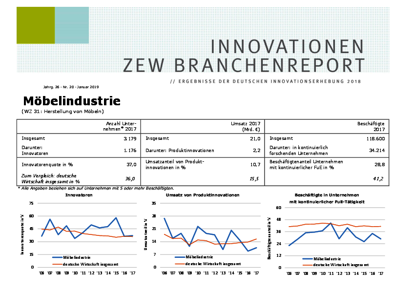 Der Branchenreport Innovation für die Branche Möbelindustrie stellt die Innovationsleistung der Branche im Jahr 2017 dar. Der Anteil der Unternehmen mit Innovationen lag bei 37,0 %. Die Innovationsausgaben im Berichtsjahr beliefen sich auf 0,23 Mrd. €. Der Umsatzanteil mit Produktinnovationen betrug 29 %.