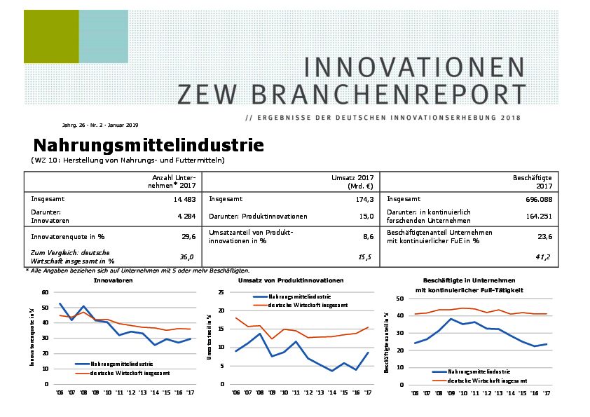 Der Branchenreport Innovation für die Branche Nahrungsmittelindustrie stellt die Innovationsleistung der Branche im Jahr 2017 dar. Der Anteil der Unternehmen mit Innovationen lag bei 29,6 %. Die Innovationsausgaben im Berichtsjahr beliefen sich auf 2,7 Mrd. €. Der Umsatzanteil mit Produktinnovationen betrug 8,6 %.
