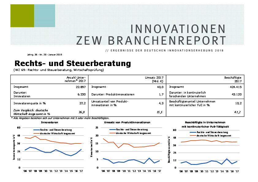Der Branchenreport Innovation für die Branche Rechts- und Steuerberatung stellt die Innovationsleistung der Branche im Jahr 2017 dar. Der Anteil der Unternehmen mit Produktinnovationen lag bei 12 %. Die Innovationsausgaben stiegen gegenüber dem Vorjahr um 14 % und betrugen somit 0,7 % des Umsatzes. Der Anteil der Innovationsausgaben für Forschung und Entwicklung lag bei 16 %.