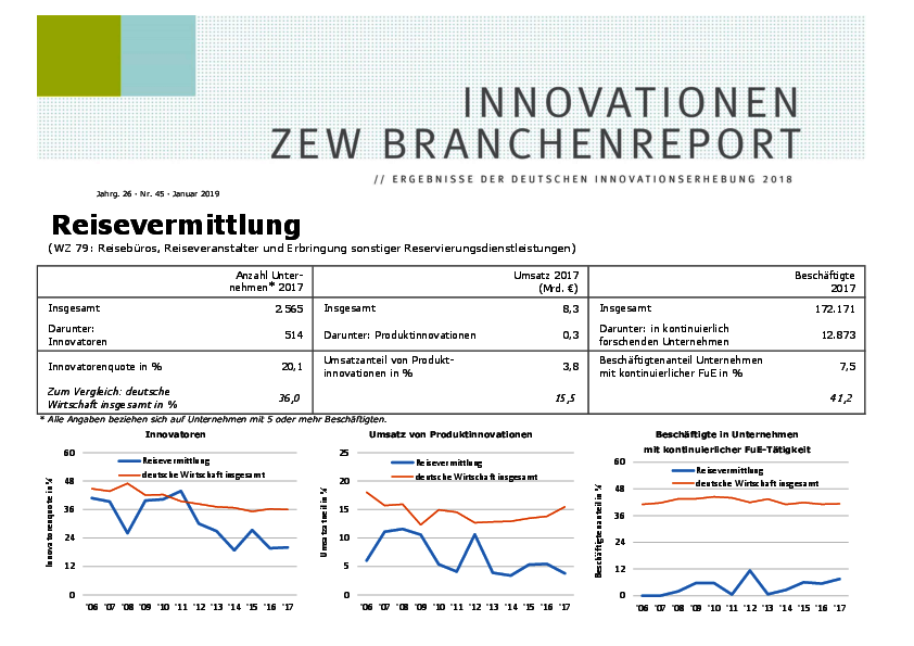 Der Branchenreport Innovation für die Branche Reisevermittlung stellt die Innovationsleistung der Branche im Jahr 2017 dar. Der Anteil der Unternehmen mit Produktinnovationen lag bei 12,0 %. Die Innovationsausgaben sanken gegenüber dem Vorjahr um 7 %. Der Umsatzanteil mit Produktinnovationen sank auf 3,8 %.