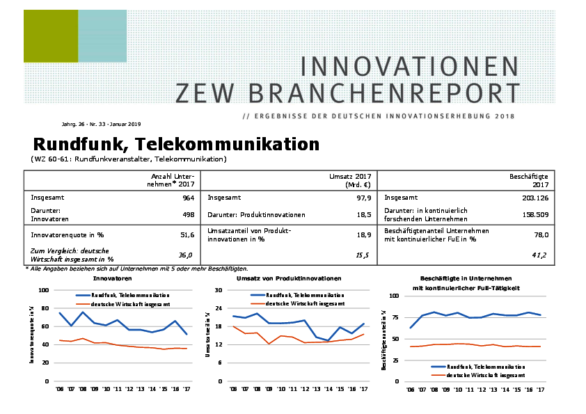 Der Branchenreport Innovation für die Branche Rundfunk und Telekommunikation stellt die Innovationsleistung der Branche im Jahr 2017 dar. Der Anteil der Unternehmen mit kontinuierlicher Forschung und Entwicklung lag bei 13 %. 51,6 % der Unternehmen führten Produkt- oder Prozessinnovationen ein. Mit Produktinnovationen wurde ein Umsatz von 18,5 Mrd. € erzielt, das sind 18,9 % des gesamten Branchenumsatzes.