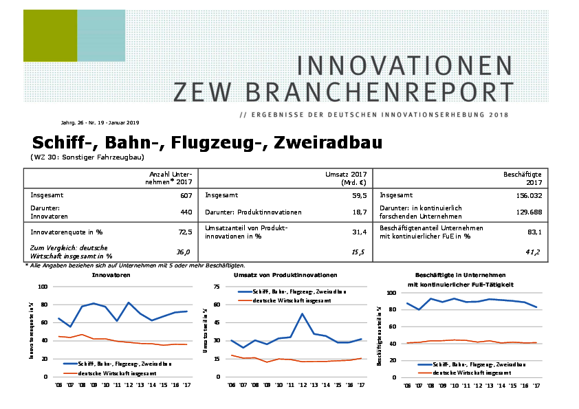 Der Branchenreport Innovation für die Branche Schiff-, Bahn-, Flugzeug- und Zweiradbau stellt die Innovationsleistung der Branche im Jahr 2017 dar. Der Anteil der Unternehmen mit Innovationen lag bei 72,5 %. Die Innovationsausgaben fielen gegenüber dem Vorjahr um 7 % auf 4,94 Mrd. €. Der Umsatzanteil mit Produktinnovationen betrug 31,4 %.