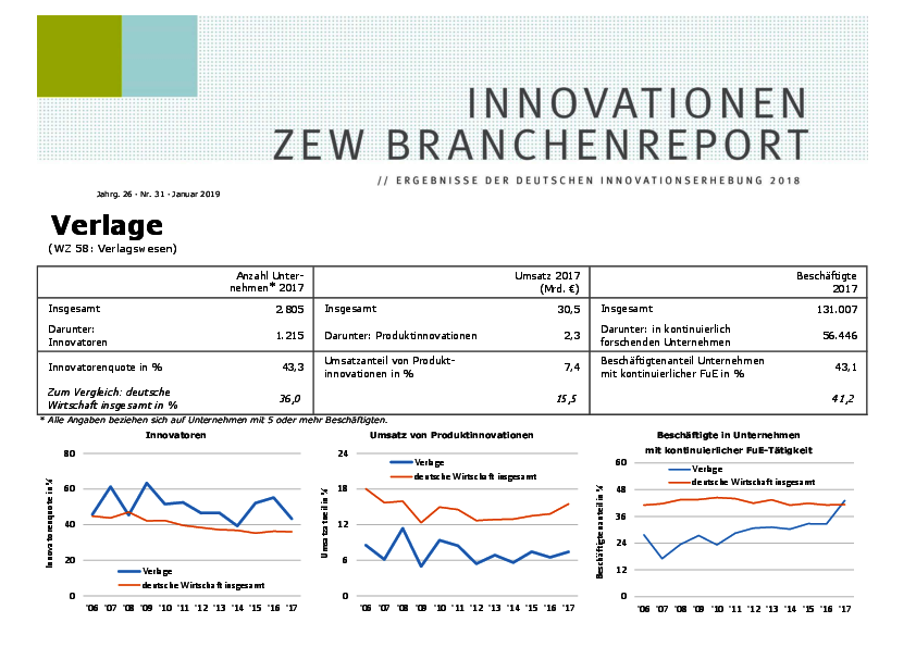 Der Branchenreport Innovation für die Branche Verlage stellt die Innovationsleistung der Branche im Jahr 2017 dar. Der Anteil der Unternehmen mit Produktinnovationen lag bei 37 %. Die Innovationsausgaben stiegen gegenüber dem Vorjahr um 36 % auf 0,88 Mrd. € und betrugen 2,9 % des Umsatzes. Der Anteil der Ausgaben für Forschung und Entwicklung unter den Innovationsausgaben lag bei 53 %.