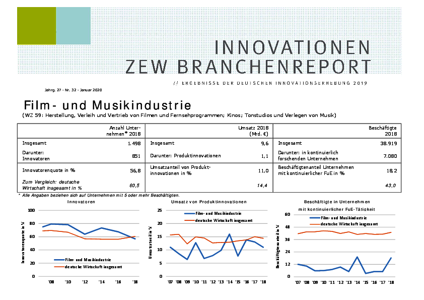 Der Branchenreport Innovation für die Branche Film- und Musikdienste stellt die Innovationsleistung der Branche im Jahr 2018 dar. Der Anteil der Unternehmen mit Innovationen lag bei 56,8 %. Die Innovationsausgaben stiegen gegenüber dem Vorjahr um 17 % auf 0,23 Mrd. €. Der Unternehmensanteil mit Produktinnovationen lag bei 40 %.