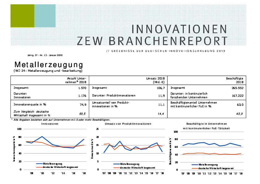 Der Branchenreport Innovation für die Branche Metallerzeugung stellt die Innovationsleistung der Branche im Jahr 2018 dar. Der Anteil der Unternehmen mit Innovationen lag bei 74,9 %. Die Innovationsausgaben fielen gegenüber dem Vorjahr um 4 % und betrugen 1,98 Mrd. €. Der Anteil der Unternehmen mit kostensenkenden Prozessinnovationen betrug 24 %.