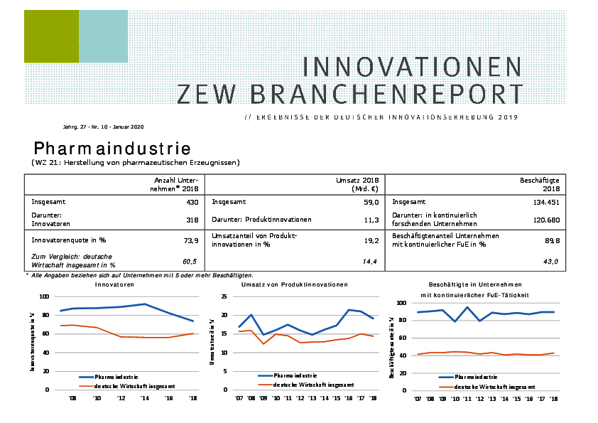 Der Branchenreport Innovation für die Branche Pharmaindustrie stellt die Innovationsleistung der Branche im Jahr 2018 dar. Der Anteil der Unternehmen mit Innovationen lag bei 73,9 %. Die Innovationsausgaben im Berichtsjahr betrugen 10,70 Mrd. €. Der Umsatzanteil mit Produktinnovationen fiel auf 19,2 %.