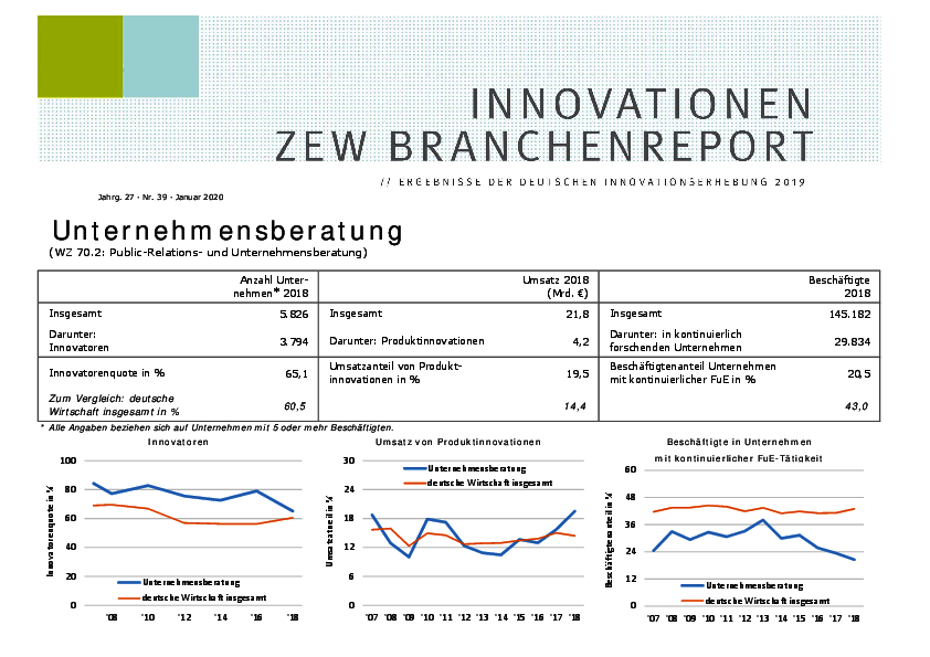 Der Branchenreport Innovation für die Branche Unternehmensberatung stellt die Innovationsleistung der Branche im Jahr 2018 dar. Der Anteil der Unternehmen mit Innovationen lag bei 65,1 %. Die Innovationsausgaben stiegen gegenüber dem Vorjahr um 55 %. Der Umsatzanteil mit Produktinnovationen stieg auf 19,5 %.