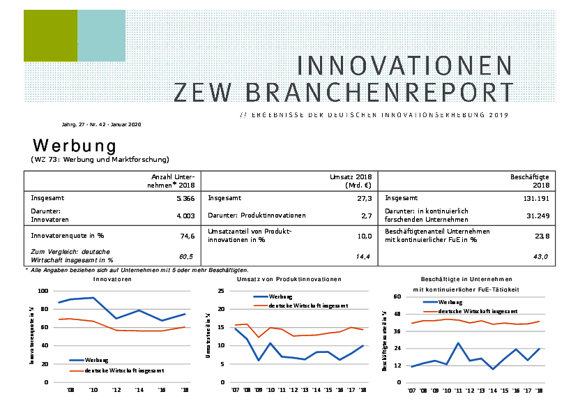 Der Branchenreport Innovation für die Branche Werbung stellt die Innovationsleistung der Branche im Jahr 2018 dar. Der Anteil der Unternehmen mit Innovationen lag bei 74,6 %. Die Innovationsausgaben stiegen gegenüber dem Vorjahr um 58 %. Der Umsatzanteil mit Produktinnovationen betrug 10,0 %.
