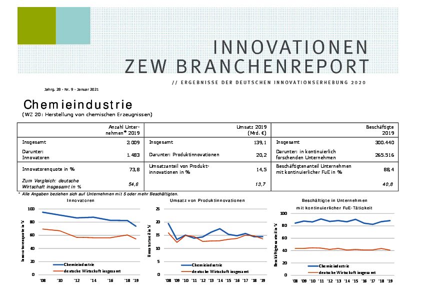 Der Branchenreport Innovation für die Branche Chemieindustrie stellt die Innovationsleistung der Branche im Jahr 2019 dar. Der Anteil der Unternehmen mit Innovationen lag bei 73,8 %. Die Innovationsausgaben fielen gegenüber dem Vorjahr um 5 % auf 6,73 Mrd. €. Der Umsatzanteil mit Produktinnovationen betrug 14,5 %.