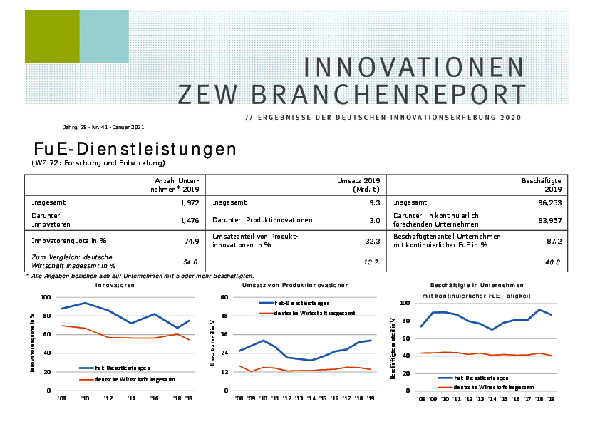 Der Branchenreport Innovation für die Branche FuE-Dienstleistungen stellt die Innovationsleistung der Branche im Jahr 2019 dar. Der Anteil der Unternehmen mit Innovationen lag bei 74,9 %. Die Innovationsausgaben stiegen gegenüber dem Vorjahr an und betrugen somit 58,2 % des Umsatzes. Der Anteil der Ausgaben für Forschung und Entwicklung unter den Innovationsausgaben betrug 85 %.