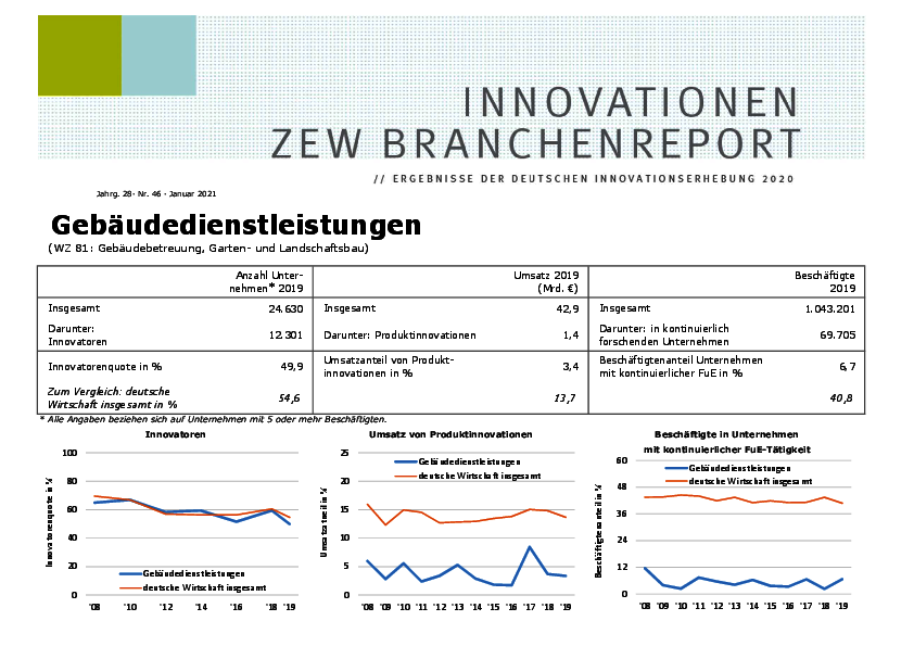 Der Branchenreport Innovation für die Branche Gebäudedienstleistungen stellt die Innovationsleistung der Branche im Jahr 2019 dar. 49,9 % der Unternehmen führten Produkt- oder Prozessinnovationen ein. Produktinnovationen leisten 1,4 % zum gesamten Umsatz der Branche. Die Innovationsausgaben nahmen gegenüber dem Vorjahreswert von 0,18 auf 0,21 Mrd. € zu. Dies entspricht einer Veränderung von 17 %.