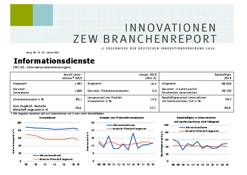 Der Branchenreport Innovation für die Branche Informationsdienste stellt die Innovationsleistung der Branche im Jahr 2019 dar. Der Anteil der Unternehmen mit Produkt- oder Prozessinnovationen lag bei 83,1 %. Die Innovationsausgaben stiegen gegenüber dem Vorjahr um 13 % auf 0,68 Mrd. €. Sie machten 4,1 % des Umsatzes aus. Der Anteil der Unternehmen mit kontinuierlicher FuE-Tätigkeit lag bei 33 %.