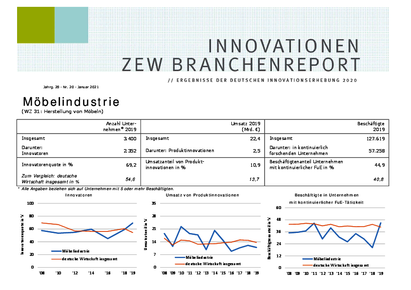 Der Branchenreport Innovation für die Branche Möbelindustrie stellt die Innovationsleistung der Branche im Jahr 2019 dar. Der Anteil der Unternehmen mit Innovationen lag bei 69,2 %. Die Innovationsausgaben im Berichtsjahr beliefen sich auf 0,36 Mrd. €. Der Umsatzanteil mit Produktinnovationen betrug 10,9 %.