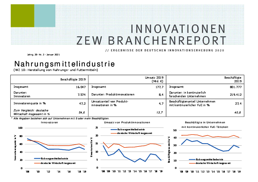 Der Branchenreport Innovation für die Branche Nahrungsmittelindustrie stellt die Innovationsleistung der Branche im Jahr 2019 dar. Der Anteil der Unternehmen mit Innovationen lag bei 47,2 %. Die Innovationsausgaben im Berichtsjahr beliefen sich auf 1,89 Mrd. €. Der Umsatzanteil mit Produktinnovationen betrug 4,7 %.