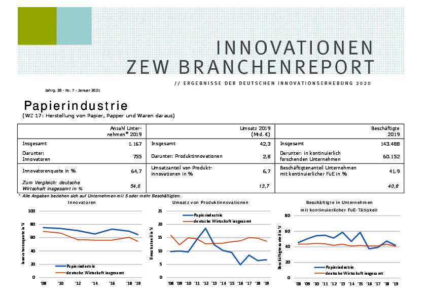 Der Branchenreport Innovation für die Branche Papierindustrie stellt die Innovationsleistung der Branche im Jahr 2019 dar. Der Anteil der Unternehmen mit Innovationen lag bei 64,7 %. Die Innovationsausgaben im Berichtsjahr betrugen 0,70 Mrd. €. Der Anteil der Unternehmen mit kontinuierlicher FuE lag bei 18 %. Der Beschäftigungsanteil von Unternehmen mit kontinuierlicher FuE betrug 41,9 %.