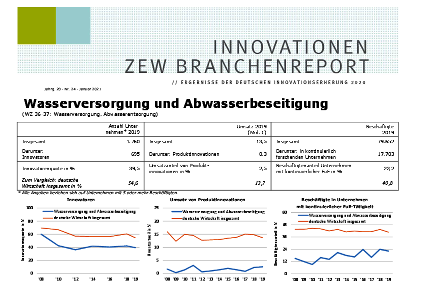 Der Branchenreport Innovation für die Branche Wasserversorgung und Abwasserbeseitigung stellt die Innovationsleistung der Branche im Jahr 2019 dar. Der Anteil der Unternehmen mit Innovationen lag bei 39,5 %. Die Innovationsausgaben stiegen gegenüber dem Vorjahr um 39 % und betrugen 0,16 Mrd. €. Der Umsatzanteil mit Produktinnovationen stieg auf 2,5 %.