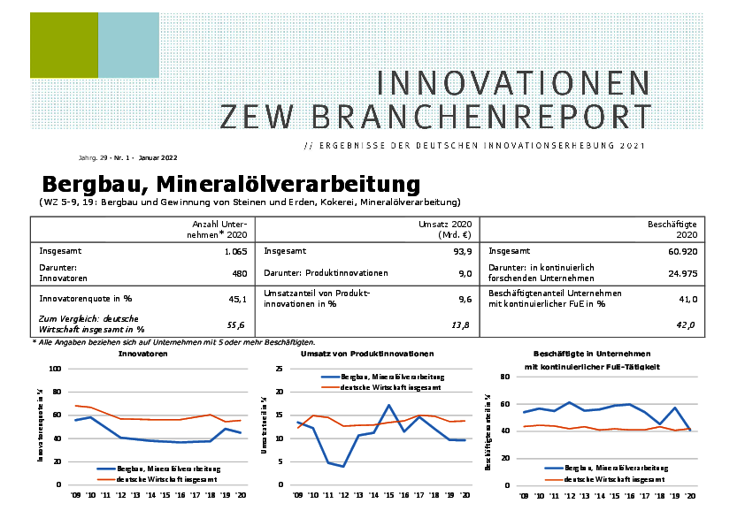 Der Branchenreport Innovation für die Branche Bergbau und Mineralölverarbeitung stellt die Innovationsleistung der Branche im Jahr 2021 dar. Der Anteil der Unternehmen mit Innovationen lag bei 45,1 %. Die Innovationsausgaben fielen gegenüber dem Vorjahr um 15 %. Der Umsatzanteil mit Produktinnovationen betrug 9,6 %.