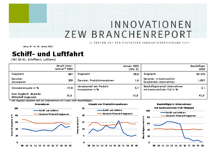 Der Branchenreport Innovation für die Branche Schiff- und Luftfahrt stellt die Innovationsleistung der Branche im Jahr 2021 dar. Der Anteil der Unternehmen mit Innovationen lag bei 44,9 %. Die Innovationsausgaben stiegen gegenüber dem Vorjahr um 14 % und betrugen somit 2,6 % des Umsatzes. 20 % der Unternehmen führten Produktinnovationen und 35 % der Unternehmen führten Prozessinnovationen ein.