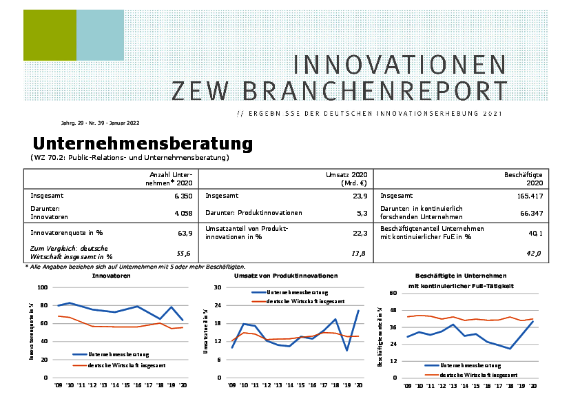 Der Branchenreport Innovation für die Branche Unternehmensberatung stellt die Innovationsleistung der Branche im Jahr 2021 dar. Der Anteil der Unternehmen mit Innovationen lag bei 63,9 %. Die Innovationsausgaben stiegen gegenüber dem Vorjahr um 15 %. Der Umsatzanteil mit Produktinnovationen stieg auf 22,3 %.