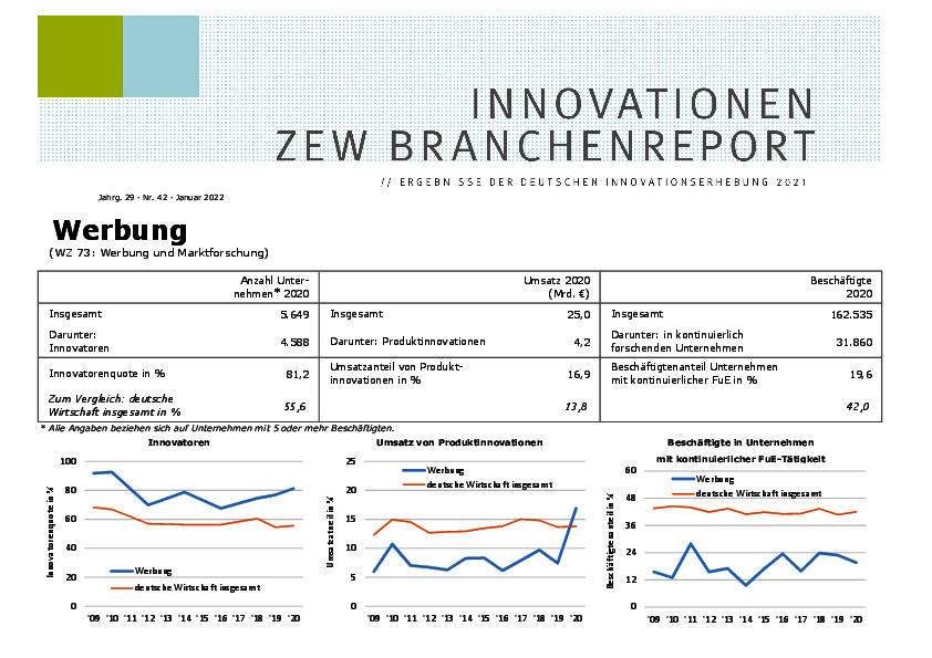Der Branchenreport Innovation für die Branche Werbung stellt die Innovationsleistung der Branche im Jahr 2021 dar. Der Anteil der Unternehmen mit Innovationen lag bei 81,2 %. Die Innovationsausgaben sanken gegenüber dem Vorjahr um 53 %. Der Umsatzanteil mit Produktinnovationen betrug 16,9 %.