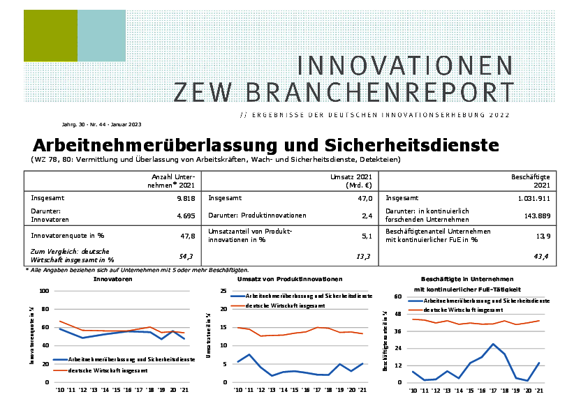 Der Branchenreport Innovation für die Branche Arbeitnehmerüberlassung und Sicherheitsdienste stellt die Innovationsleistung der Branche im Jahr 2022 dar. Der Anteil der Unternehmen mit Produktinnovationen lag bei 17 %. Die Innovationsausgaben stiegen gegenüber dem Vorjahr um 71 % und betrugen somit 0,3 % des Umsatzes. Durch Prozessinnovationen konnten Kosteneinsparungen von 0,8 % erzielt werden.