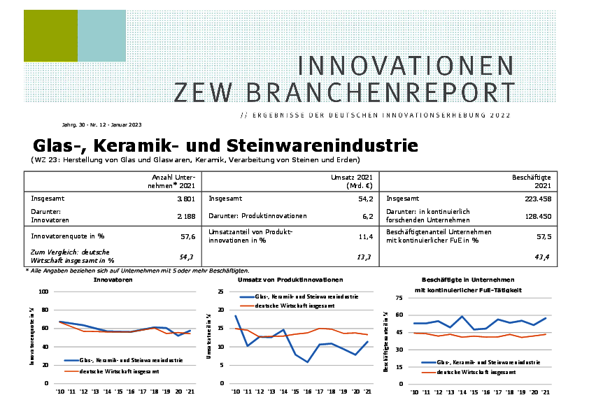 Der Branchenreport Innovation für die Branche Glas-, Keramik- und Steinwarenindustrie stellt die Innovationsleistung der Branche im Jahr 2022 dar. Der Anteil der Unternehmen mit Innovationen lag bei 57,6 %. Der Anteil der Innovationsausgaben am Branchenumsatz (Innovationsintensität) betrug im Berichtsjahr 2,8 %. 21 % der Unternehmen wiesen kostensenkenden Prozessinnovationen auf.