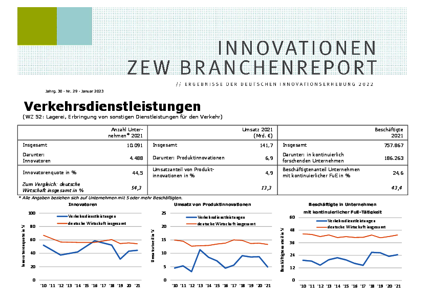 Der Branchenreport Innovation für die Branche Verkehrsdienstleistungen stellt die Innovationsleistung der Branche im Jahr 2022 dar. Der Anteil der Unternehmen mit Innovationen lag bei 44,5 %. Die Innovationsausgaben steigen gegenüber dem Vorjahr um 18 % auf 3,19 Mrd. €. Der Unternehmensanteil mit Produktinnovationen betrug 21 % und der Unternehmensanteil mit Prozessinnovationen betrug 41 %.