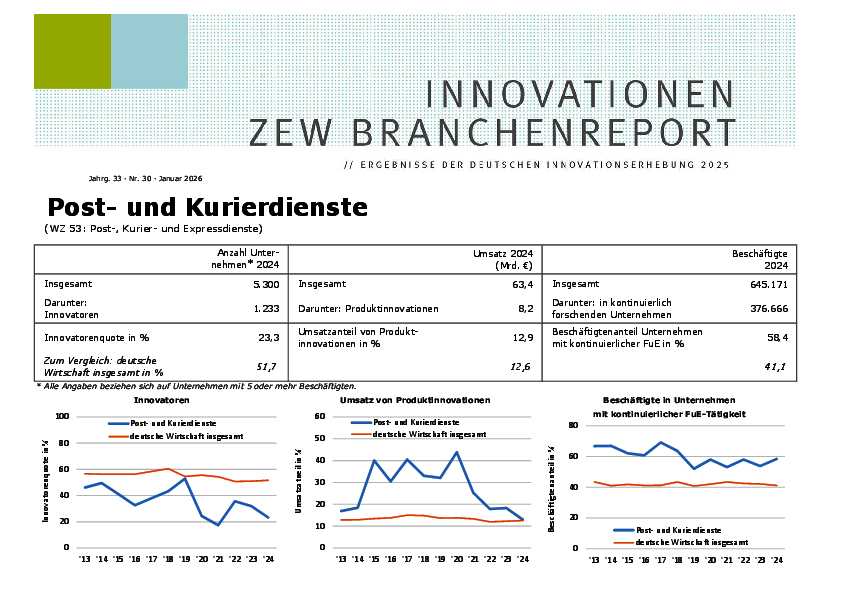 Der Branchenreport Innovation für die Branche Post- und Kurierdienste stellt die Innovationsleistung der Branche im Jahr 2024 dar. Der Anteil der Unternehmen mit Innovationen lag bei 23,3 %. 5 % der Unternehmen führten Produktinnovationen und 23 % der Unternehmen führten Prozessinnovationen ein. Der Umsatzanteil mit Produktinnovationen lag bei 12,9 %.