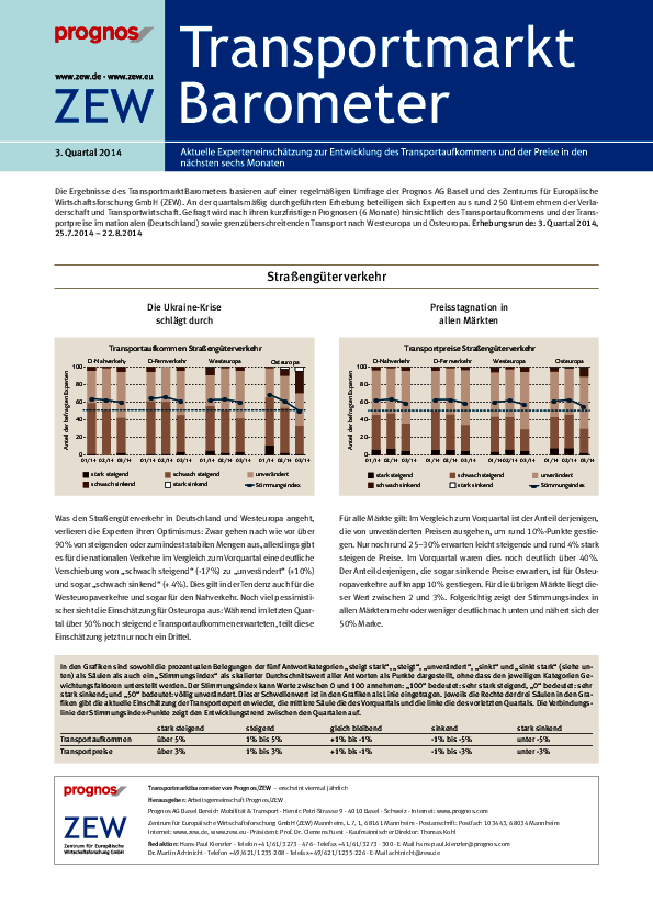 Die Transportwirtschaft in Deutschland muss sich im kommenden halben Jahr auf geringere Transportmengen und stagnierende beziehungsweise bei einigen Transportzweigen und Relationen auch rückläufige Transportpreise einstellen. Insbesondere gilt das für die Landverkehre nach Osteuropa, die von der Ukraine-Krise in besonderem Maße betroffen sind. Dies sind wesentliche Ergebnisse des TransportmarktBarometers von Prognos/ZEW im dritten Quartal 2014. Bei dieser Erhebung fragen die Prognos AG, Basel, und das Zentrum für Europäische Wirtschaftsforschung (ZEW), Mannheim, vierteljährlich rund 250 Spitzenkräfte aus der Transportwirtschaft und der verladenden Wirtschaft, wie sie die Entwicklung der Transportmärkte und der Transportpreise auf Sicht von sechs Monaten einschätzen.