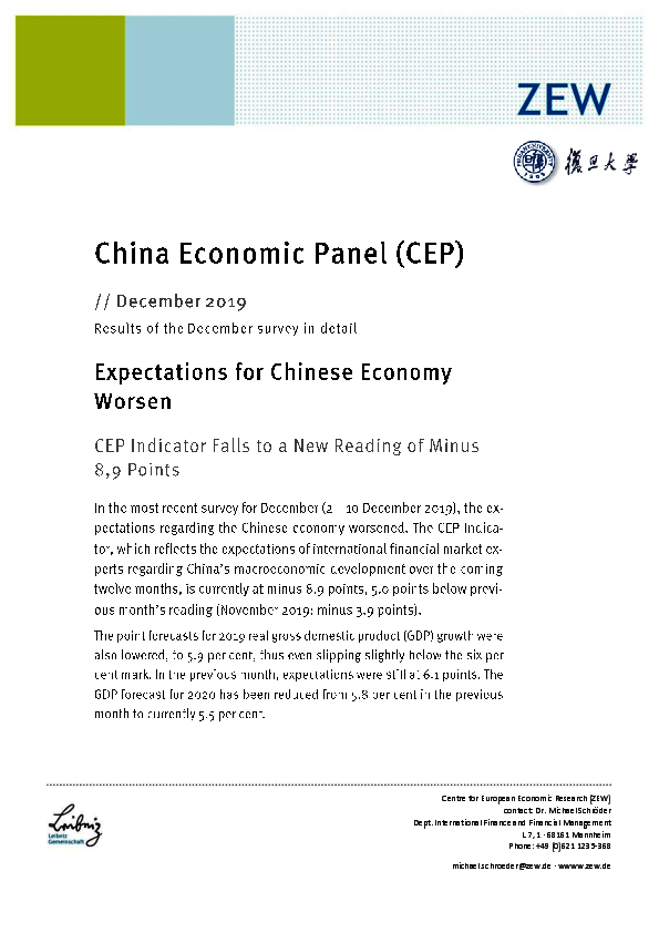 China Economic Panel (CEP) // 2019- Expectations for Chinese Economy Worsen: CEP Indicator Falls to a New Reading of Minus 8.9 Points