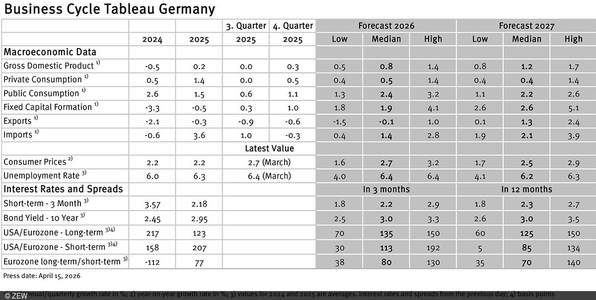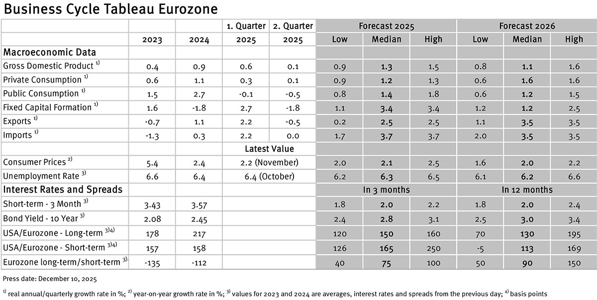 Numerous banks and economic research institutes regularly publish reports on the current and future economic situation in Germany and the Eurozone. We scan these publications and compile the relevant information to compute a median, minimum and maximum of the available forecasts for the current and subsequent year. We mainly focus on national business cycle reports and complement the tableaus with forecasts form international banks and institutes. The tableau for the Eurozone is augmented by data from European banks and institutes.