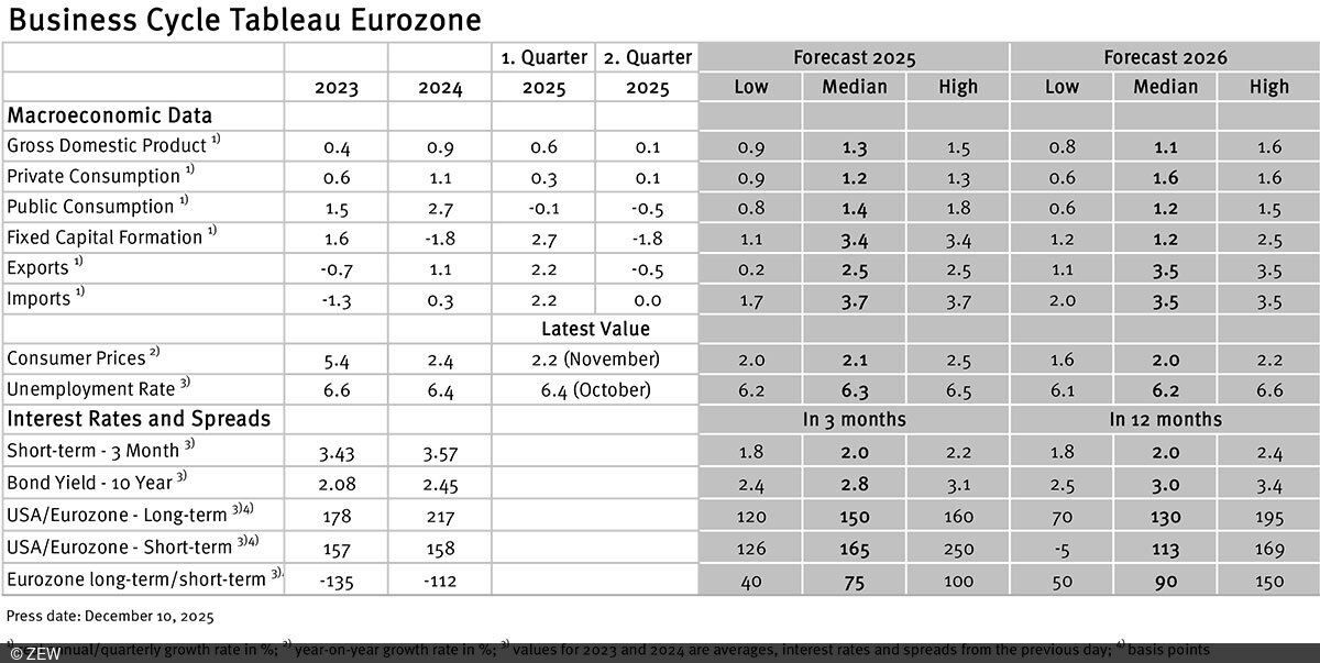 ZEW regularly monitors and analyses current economic developments in Germany and the eurozone in its monthly economic forecasts. In doing so, our researchers rely on existing forecasts by economists from banks, research institutes and supranational institutions, which they compile and evaluate.