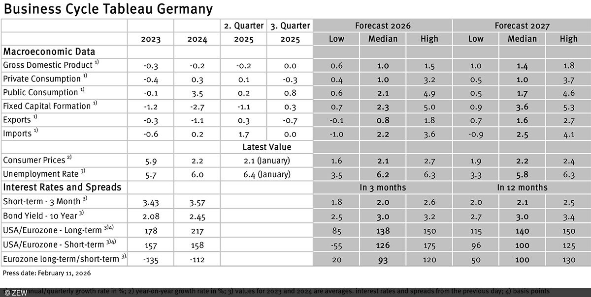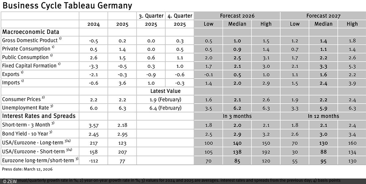 From January 2013 on, ZEW will publish monthly business cycle tableaus for Germany and the Eurozone in cooperation with Börsen-Zeitung. The tableaus will show current forecasts for Gross Domestic Product (GDP), its main components, consumer price inflation, industrial production, unemployment rate, short- and long-term interest rates, and interest rate spreads.