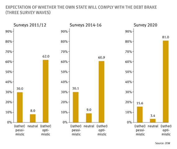 Press Releases // 14.01.2021federal government’s structural – i.e. cyclically adjusted – deficit to 0.35 per cent of GDP since the fiscal year 2016. For the state governments, this legislation became binding in 2020 – albeit with exceptions [...] “The debt brake has helped contain the debt level in German over the past decade. Thanks to this consolidation process at a time of favourable economic development, Germany has been better able than almost [...] Professor Friedrich Heinemann, research department head at ZEW and co-author of the study. The severe fiscal shock triggered by the coronavirus pandemic is one of these exceptions, and it has intensified the