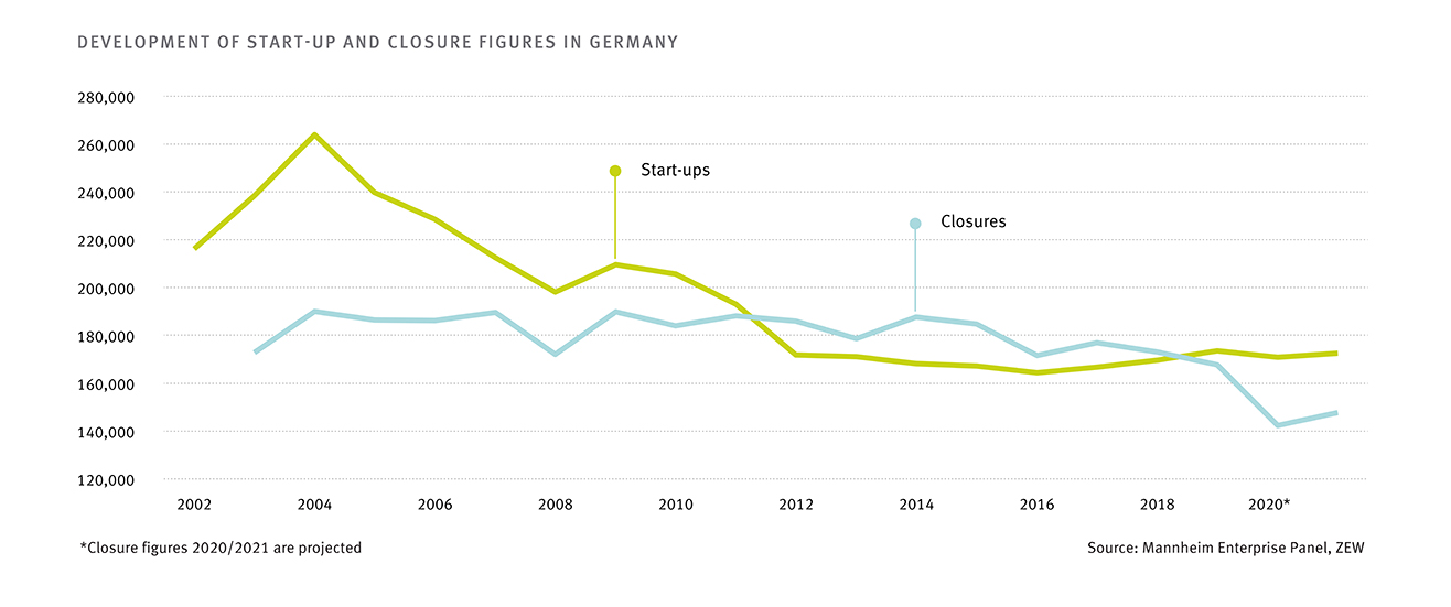 Press Releases // 19.08.2021conducted by ZEW, recorded around 156,000 firm closures, for example due to withdrawal from business or insolvency. - According to the study authors, many founders have stuck to their start-up plans despite the [...] the extended short-time working scheme and the temporary suspension of the obligation to file for insolvency played a decisive role in ensuring that the number of start-ups did not collapse in 2020,” explains