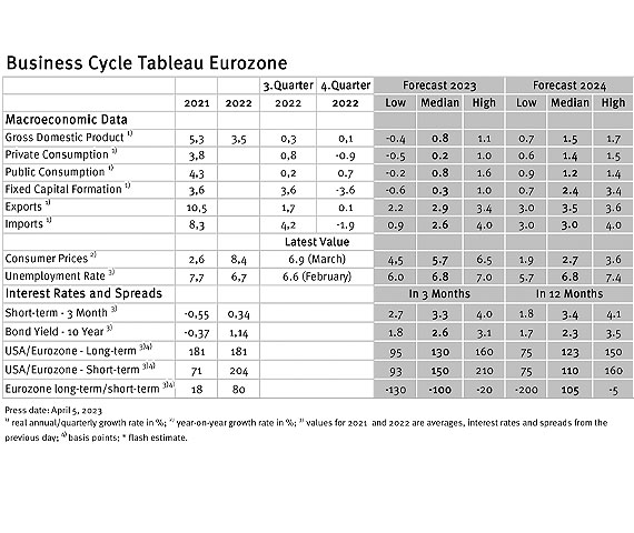 News // 21.04.2023Inflation is likely to continue to fall, but it is not expected to come closer to the European Central Bank’s target rate until next year. These are the results of the business cycle tableaus by ZEW Mannheim [...] percentage points higher than in the previous month. This is mainly due to more favourable forecasts for private consumption, fixed capital formation and net exports.