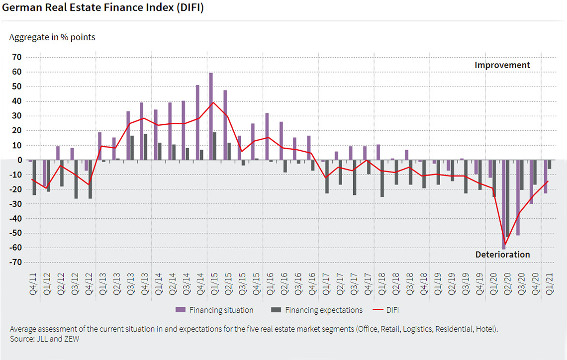 News // 17.03.2021positive outlook regarding the financing situation for office and hotel properties in the next six months - With regard to the office real estate financing market, the experts surveyed indicated that they plan [...] The German Real Estate Finance Index (DIFI) by ZEW Mannheim and JLL continues its recovery in the first quarter of 2021. Despite the gain, it still remains in the red with a total of minus 14 points (plus [...] important or extremely important factors. These are the key findings of the survey on the commercial real estate financing market in Germany, conducted on a quarterly basis by ZEW in cooperation with JLL