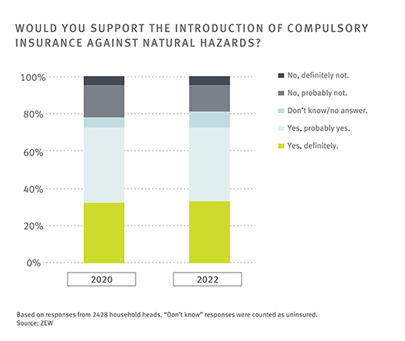 Press Releases // 01.06.2022support the introduction of mandatory insurance against flood damages and other natural hazards. Support has risen slightly following the flood disaster in 2021. This is the result of a representative [...] without abandoning market principles,” says Dr. Daniel Osberghaus, expert on climate adaptation and flood prevention at ZEW Mannheim and author of the ZEW policy brief. “Moreover, there are many reasons to