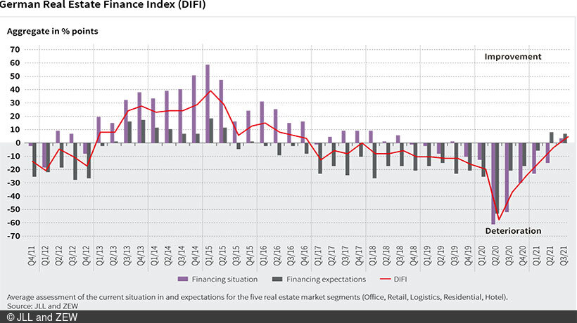 The German Real Estate Finance Index (DIFI) by ZEW Mannheim and JLL continues its upward trend. In the third quarter of 2021, it increases for the fifth time in a row and stands at 5.6 points (up 8.9 points compared to the previous quarter). This is the first time since the fourth quarter of 2017 that the index has moved above the zero mark.