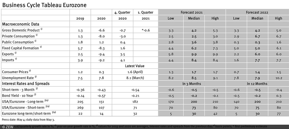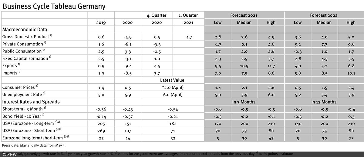 The economic experts are unimpressed by the weakness in growth witnessed again at the beginning of the year. This is the result of the business cycle tableaus by ZEW Mannheim and the German daily newspaper, Börsen-Zeitung. Although Germany’s gross domestic product (GDP) declined by 1.7 per cent in the first quarter of 2021 compared to the previous quarter, the GDP forecasts for 2021/22 remain virtually unchanged. For 2021, the forecast is slightly higher at 3.6 per cent, while for 2022 the median forecast remains at 4.0 per cent. The experts are therefore not revising their expectation of strong economic growth, but merely postponing it.
