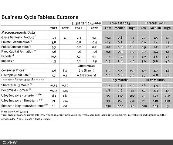 In cooperation with Börsen-Zeitung, ZEW has been publishing monthly business cycle tableaus for Germany and the eurozone with economic key figures and forecasts since 2013. Numerous banks and institutes publish reports on the current and prospective economic situation at different intervals. The information relevant for the tableau is filtered out of these publications to compute a median, minimum and maximum of the available forecasts for the current and subsequent year.