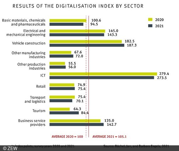 Almost the entire German economy has become more digital than it was in 2020, according to the Digitalisation Index 2021, which is calculated on an annual basis as part of the project “Measuring the degree of digitalisation in the German economy”. The project is conducted by a consortium formed by ZEW Mannheim (consortium leader), the Cologne-based German Economic Institute (IW), IW Consult, the Institute for Industrial Management FIR at RWTH Aachen University, and the German Institute for Economic Research (DIW) on behalf of the Federal Ministry for Economic Affairs and Energy.
