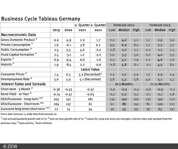 At the beginning of 2021, economic experts had still expected significantly higher growth and, above all, a considerably lower inflation rate for Germany. For 2022, they hope to see the economic growth actually forecast for 2021 for Germany and Europe. Although the current inflation forecasts are being raised, the annual rate of price increase is estimated to be declining. This is the result of the business cycle tableaus by ZEW Mannheim and the German daily newspaper, Börsen-Zeitung.