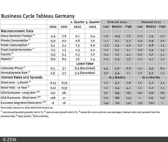 Business cycle experts are less pessimistic about real gross domestic product (GDP) growth in Germany and the eurozone, projections are less negative. In the eurozone, however, growth forecasts improve slightly more. These are the results of the business cycle tableaus by ZEW Mannheim and the German daily newspaper, Börsen-Zeitung, published on 13 January 2023.