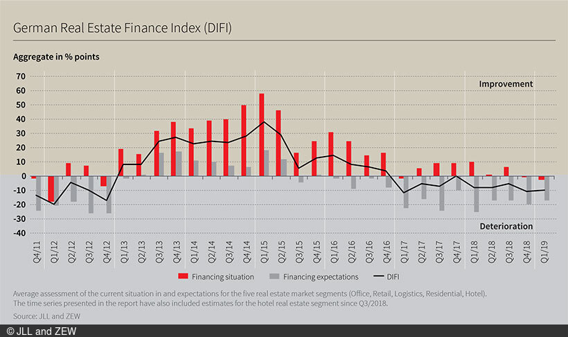 DIFI Report by ZEW and JLLThe German Real Estate Finance Index (DIFI) by ZEW and JLL stagnates at a current reading of minus 9.7 in the first quarter of 2019. The index has remained in negative territory for almost two years now. The experts’ persistently pessimistic financing expectations reflect the subdued global economic situation as well as the economic and geopolitical tensions between the major powers. The uncertainties that come with a no-deal Brexit and its possible negative effects on German companies also contribute to this pessimism.